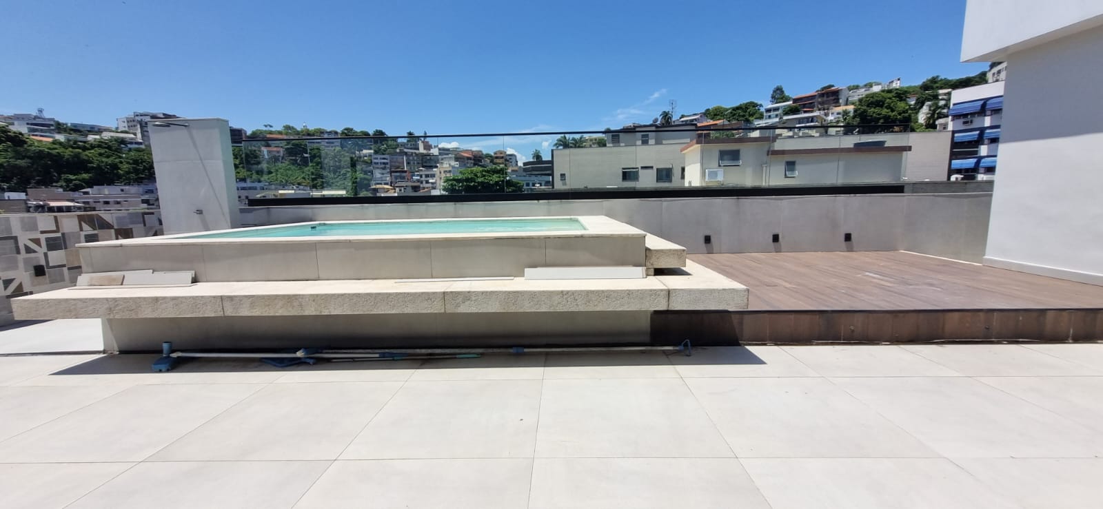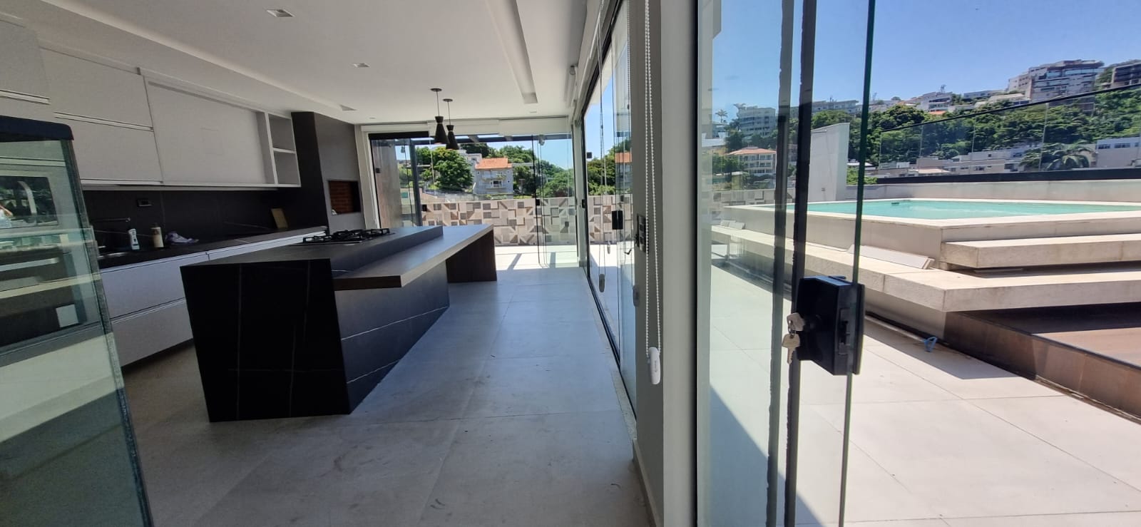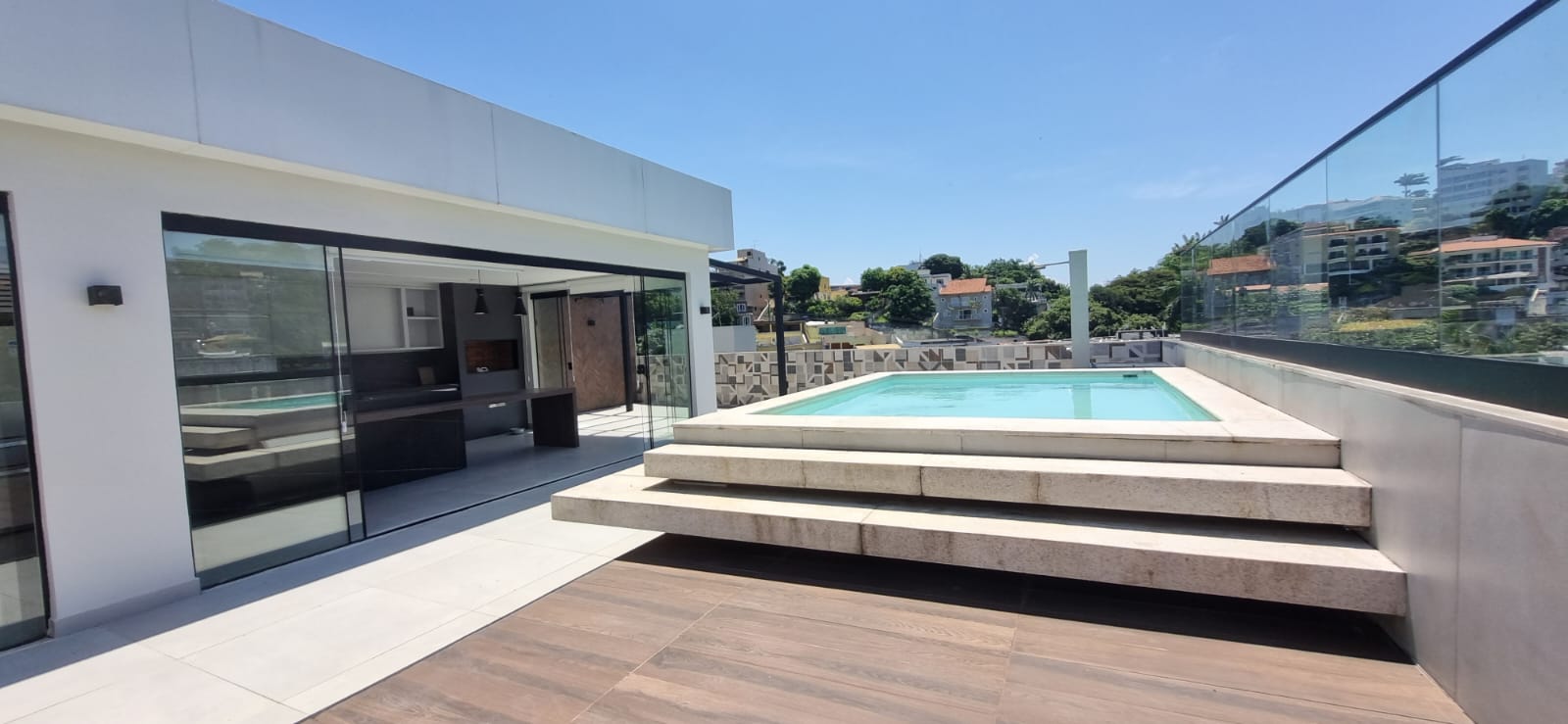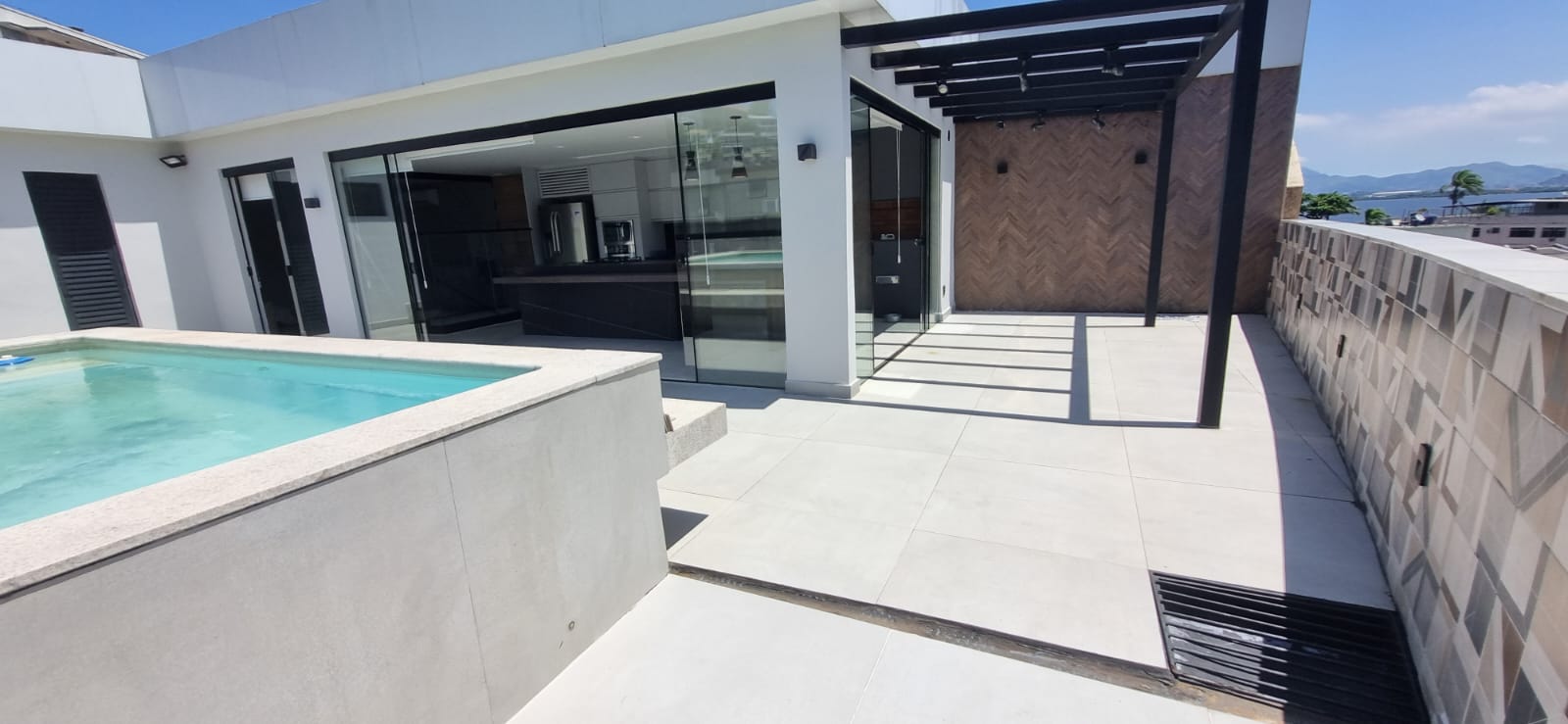 A cobertura é duplex, nova e pronta para moradia. Os dois andares foram projetados com área gourmet. Isto é, você terá um ambiente climatizado com televisão e espaço gourmet na varanda do primeiro piso; assim como, uma espaço lindíssimo com fechamento em vidro, com uma cozinha completa para atender o andar superior e área externa com piscina.